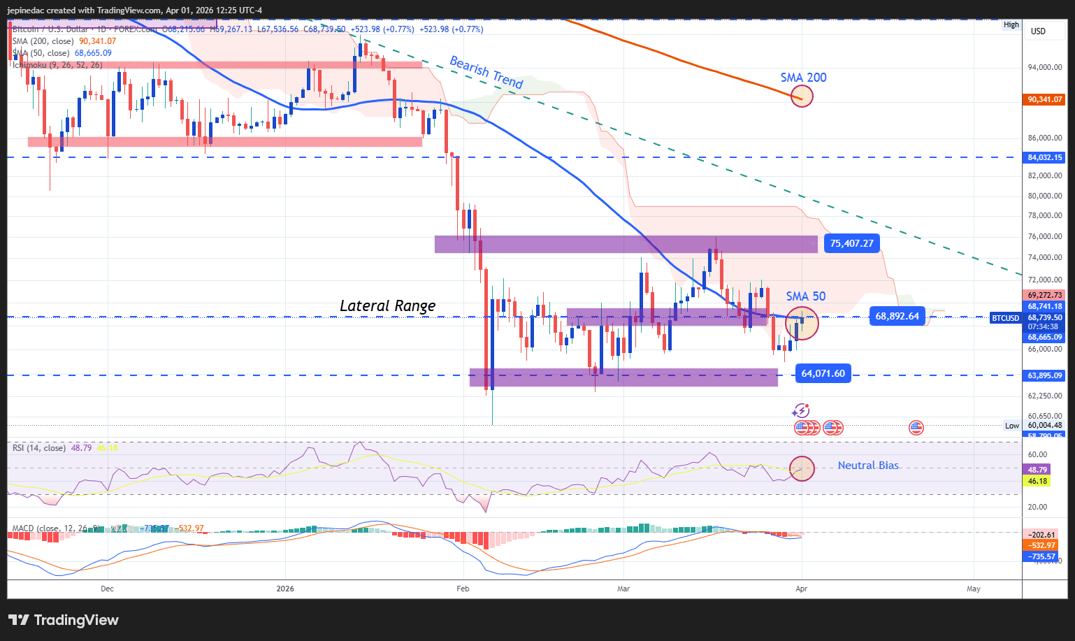 - 69,000 – Near-term barrier: A neutral level aligned with the 50-period simple moving average. Price action around this level could continue to reinforce a sideways trading environment in the near term.