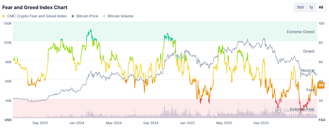 Recent movements in the crypto Fear and Greed Index show a decline from the “neutral” zone, now hovering around 33 points, back in “fear” territory. This reflects that the recovery in market confidence has not been sustained, keeping risk perception elevated within the crypto market.