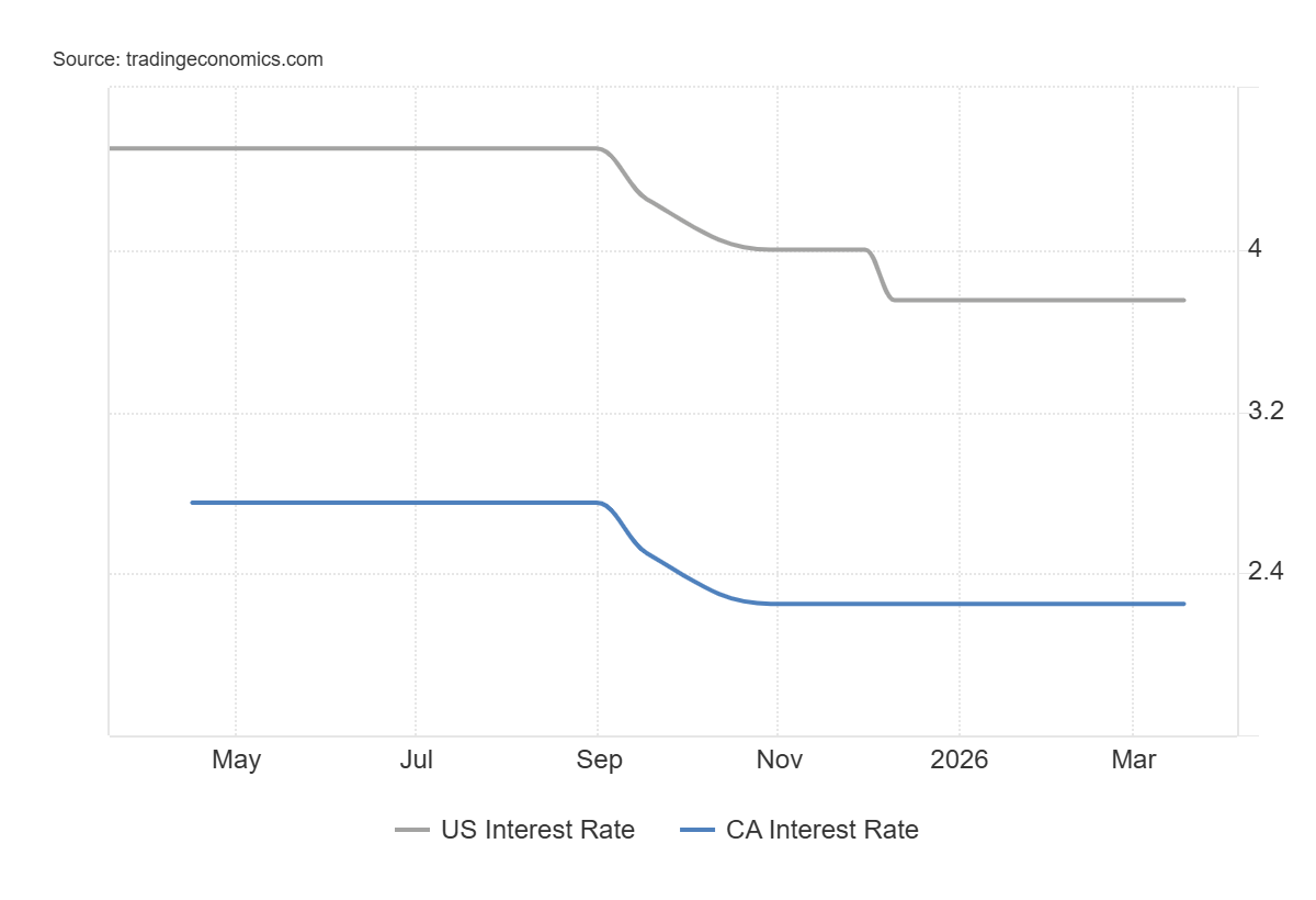 What stands out in this environment is that the rate differential continues to favor the United States. Currently, the U.S. policy rate stands at 3.75%, while Canada remains at 2.25%, which continues to support the attractiveness of U.S. dollar–denominated investments over Canadian dollar assets.