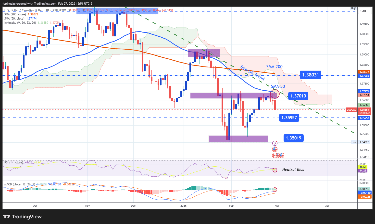 - Nothing halts the downward trendline: Since late November 2025, USD/CAD has maintained consistent bearish swings, forming a descending trendline on the daily chart. Despite recent recovery attempts, bullish moves have not been strong enough to break this structure, which remains the most relevant technical reference in the short term. If selling pressure persists, the dominance of this trendline could extend in the coming sessions.