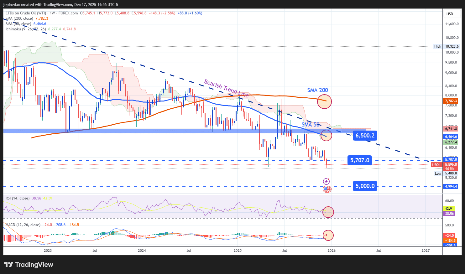 - The Downtrend Remains Dominant: Since May 2022, the WTI weekly chart has shown a consistent downward trend, with selling momentum once again pushing the price below 60 dollars. The absence of significant bullish corrections throughout 2025 keeps this formation as the most relevant long-term technical structure, likely to continue dominating downward movements in the coming months, especially if key support levels below psychological thresholds such as 60 and 50 dollars are broken. As long as price remains below the 50-week simple moving average, the market bias may remain bearish heading into 2026.