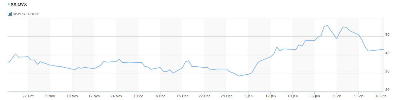 The OVX index, which measures implied volatility in oil ETF options, serves as a gauge of market expectations for price movement. Currently, the OVX has declined toward the 40-point area after having traded above 50 points in early February, reflecting a sustained reduction in implied volatility.