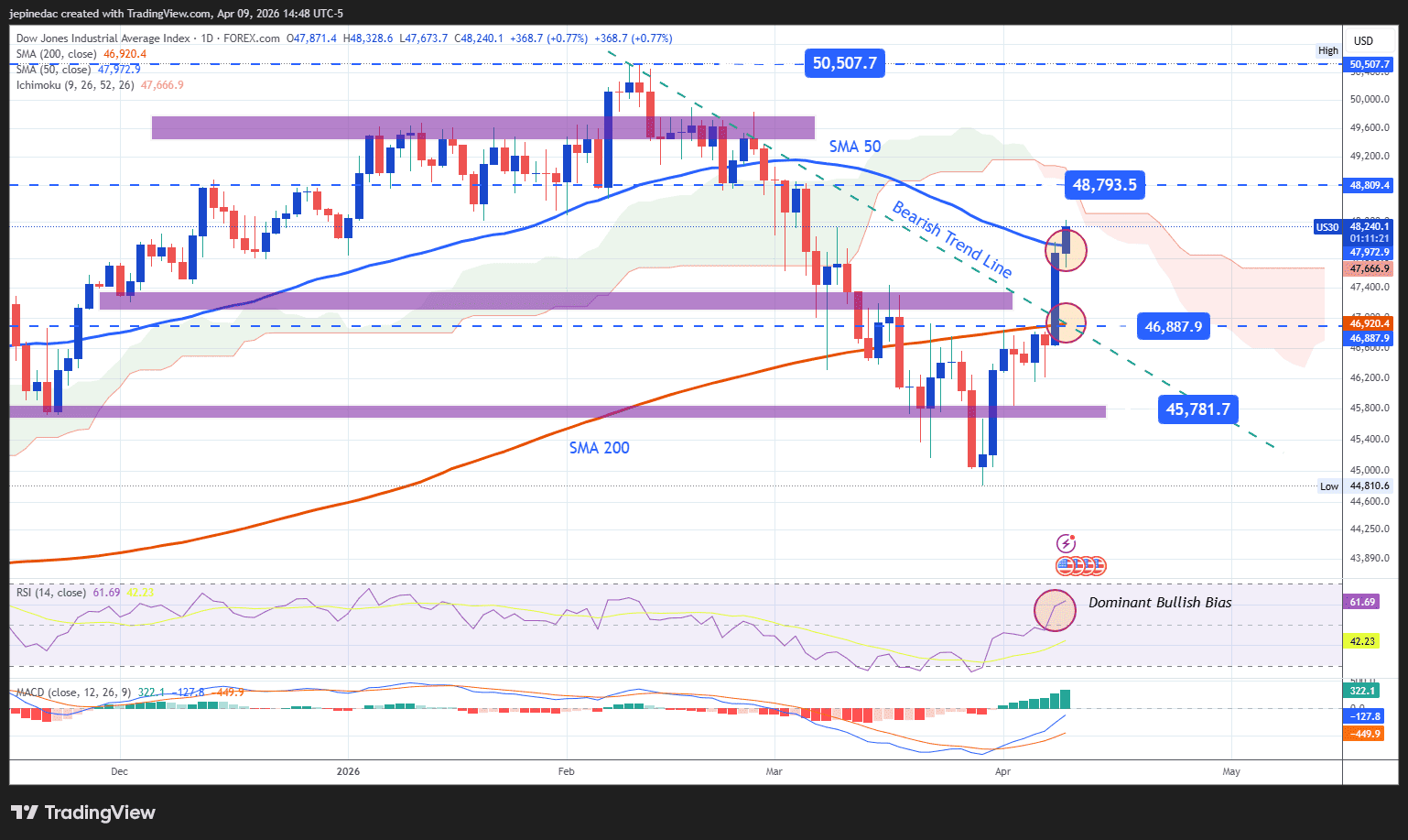 - Bullish momentum reshapes the structure: The recent recovery in the Dow Jones has been strong enough to break above a downtrend line that had been in place since early February, suggesting a potential shift in market structure. If bullish pressure continues, this could lead to the formation of a new short-term uptrend in the coming sessions.