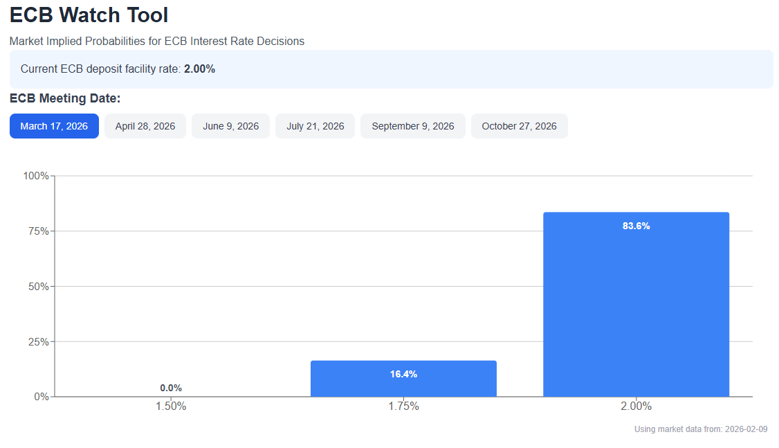 Beyond developments in the United States, market-implied probabilities for the European Central Bank indicate an 83.6% chance that interest rates will remain unchanged at 2.00% at the March 17 meeting. In addition, probabilities for rates to remain in neutral territory stay above 50% through October 2026, suggesting that the ECB does not currently envision an aggressive rate-cutting cycle, in contrast to what could unfold in the United States.