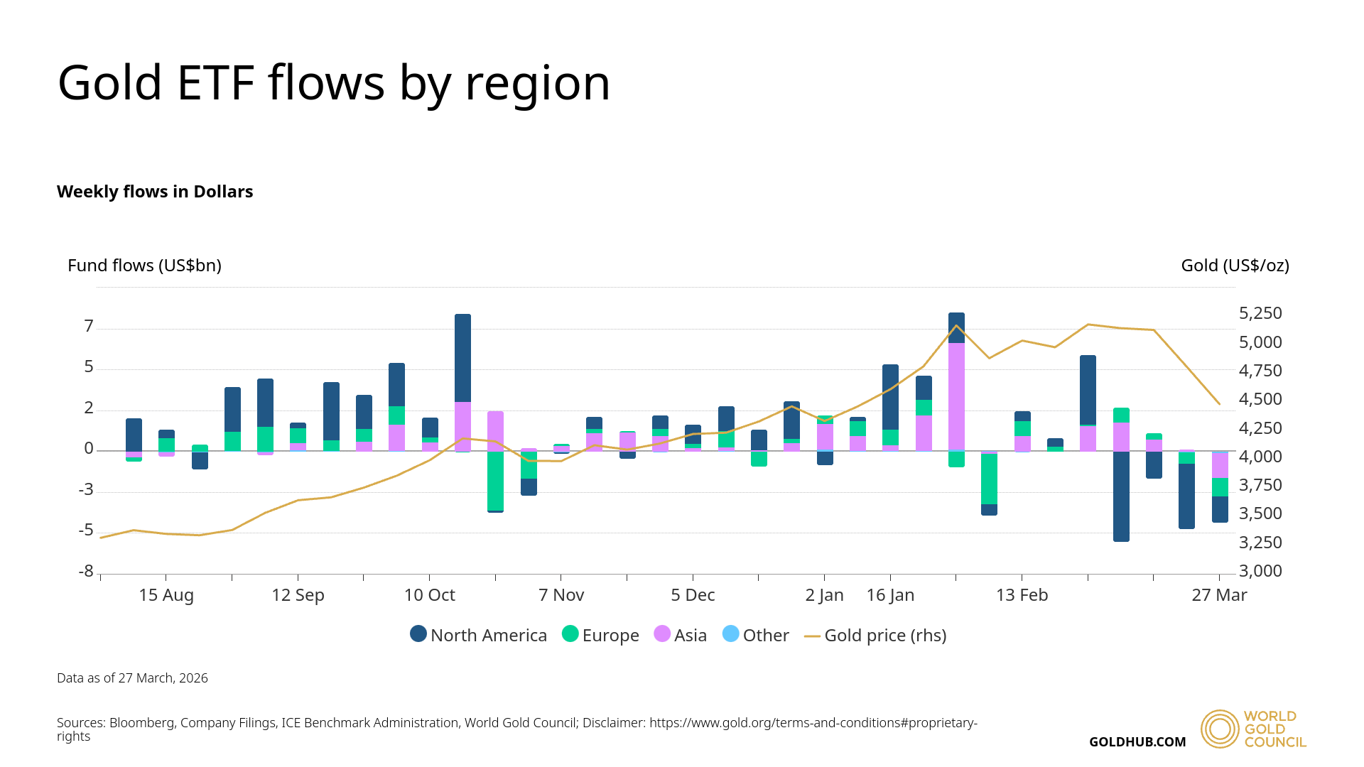 In fact, capital flows into gold ETFs have shown consistent outflows since the week of March 6, totaling more than $4.3 billion by the week ending March 27. This confirms a loss of interest in gold as the market shifts toward other assets.