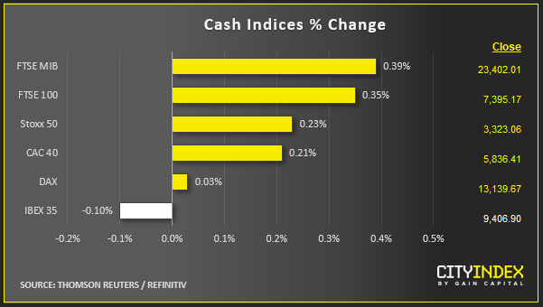 - Mining and Financials were the other broad industrial segments in the green, though the remaining 9 STOXX super sectors were lower, denoting that current market advances are relatively narrow. Broader gains will be required if stocks are to extend their recent swing higher this week