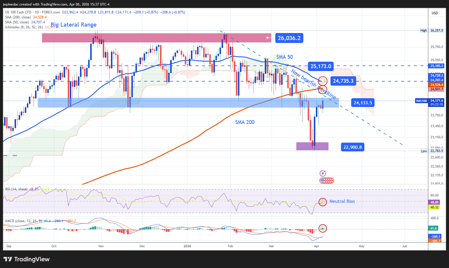 - 24,735 points – Key resistance: This level aligns with a potential break of the downtrend line and key moving averages. A sustained move above this level could lead to a more dominant bullish bias.