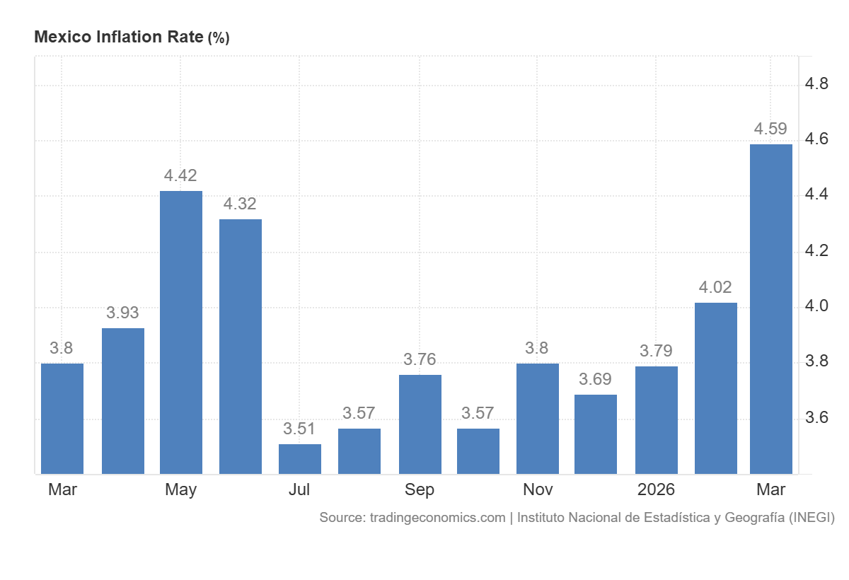During today’s session, Mexico’s annual inflation rate was released, coming in at 4.59% for March, in line with expectations of 4.6%, but still well above the central bank’s target near 3.00%.