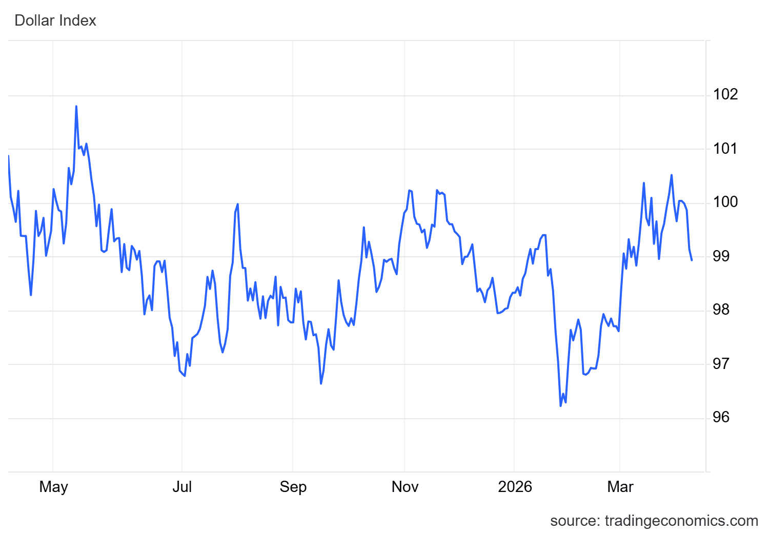The DXY index, which measures the strength of the dollar against its major peers, has shown a decline from the 100 level toward levels below 99, reflecting weaker demand for the currency in the short term.