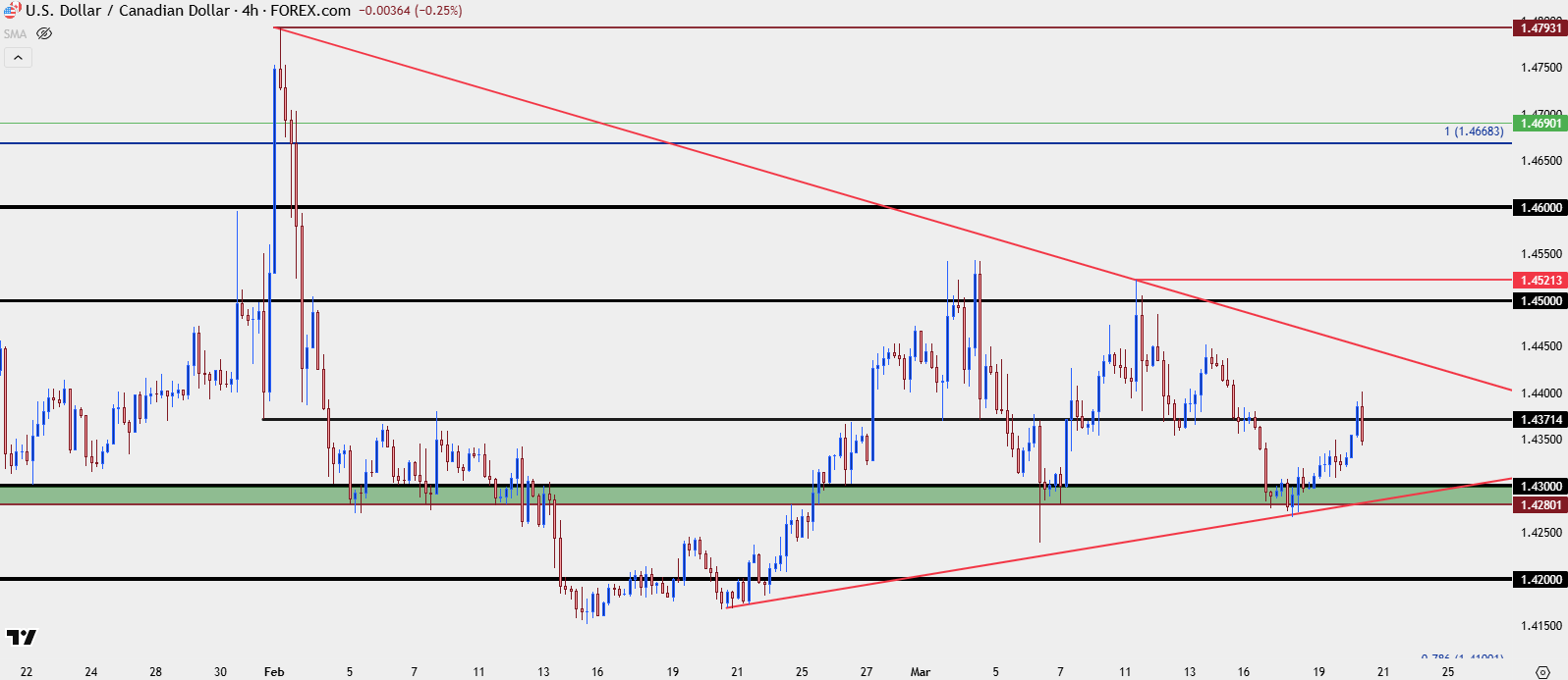 This would help to explain the lower-highs that have held in USD/CAD since that initial flare in February, with the 1.4500 level coming in more recently to cap the advance in the pair.