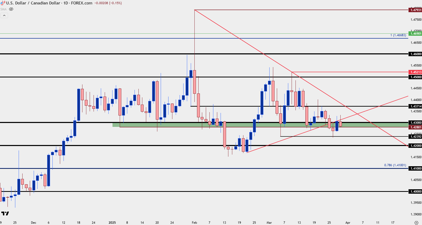 Tensions were pretty firm around the New Year open, as was the upside trend in USD/CAD. Initially, tariffs were said to come into effect on ‘day one’ of Trump’s term, but when that didn’t happen the pair pulled back. Tariffs were then set to come into effect on February 1st, and that’s when the tension seemed to climax as USD/CAD broke out in a very big way at the February open, hitting a fresh 20-plus year high. But, when that tariff date was pushed back to March, the pair slid and reversed those prior gains.