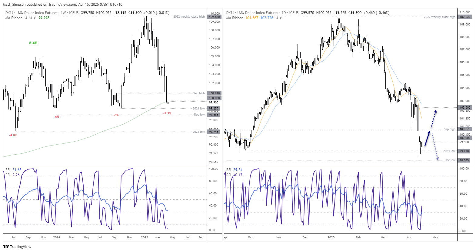 The weekly chart of the U.S. Dollar Index closed just below the 100- and 200-week SMAs, though not with enough conviction to confirm a breakdown. This leaves room for a potential bounce. Notably, price action remains within the lower wick of last week's candle, highlighting hesitation among bears to push the dollar to new lows. The weekly and daily RSI (2) both dipped into oversold territory last week.
