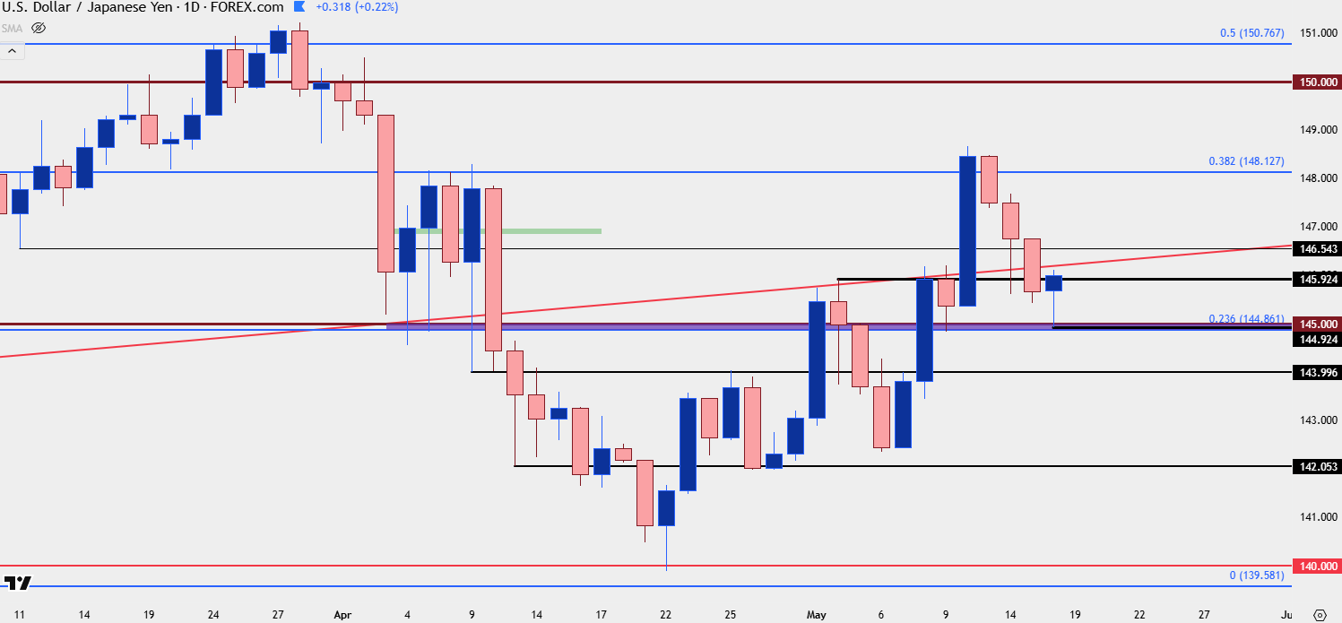 USD/JPY still seems to be doing a lot of the driving on the USD move. The strong breakout to start the week in DXY was coupled with a 148 test in USD/JPY. But the next three days saw bulls pull back on the throttle from both markets, allowing for a 145.00 re-test in USD/JPY, which I had highlighted in the Thursday article. I still think there’s more amenable pastures for both Yen-strength and Yen-weakness, but as we go into next week I’m considering USD/JPY at a higher-low given the hold of 145.00 and, notably, above the swing-low from the prior Friday.