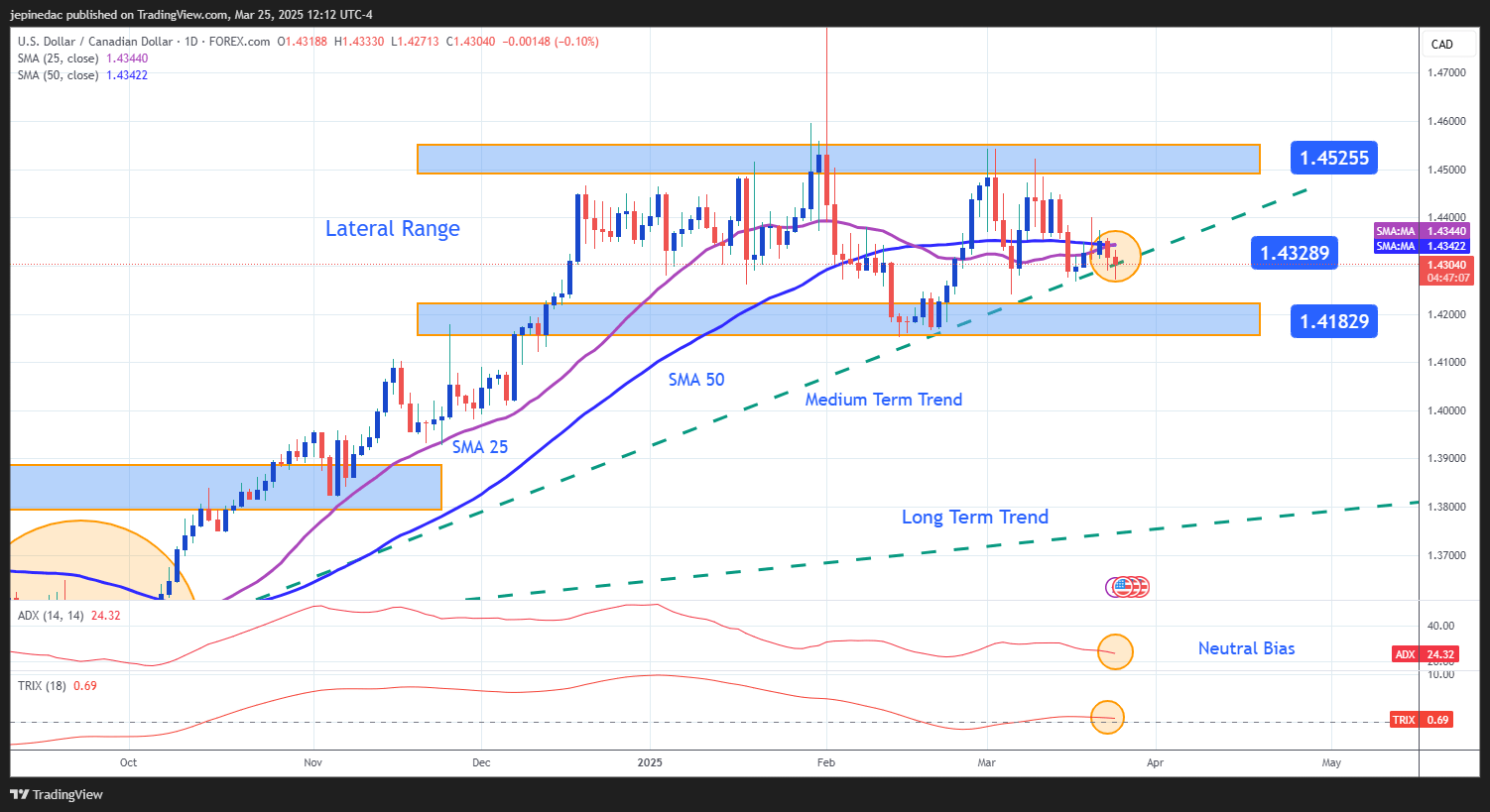 USD/CAD has been showing neutral price action in the short term. Over the last five sessions, price fluctuations have barely reached a 0.5% variation, as the pair continues hovering around a key barrier near the 1.43289 level. This calm occurs amid new developments regarding the trade war and recent moves from central banks.