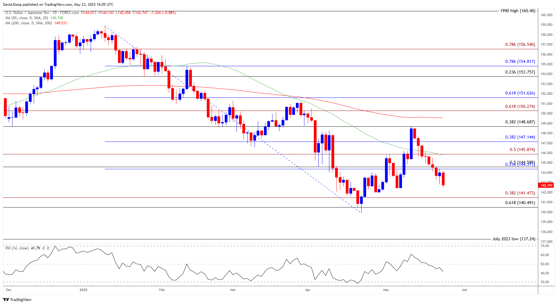 USD/JPY approaches the monthly low (142.36) as US President Donald Trump plans to impose a 50% tariff on the European Union starting on June 1, and the exchange rate may struggle to retain the rebound from the yearly low (139.89) as it extends the series of lower highs and lows carried over from last week.