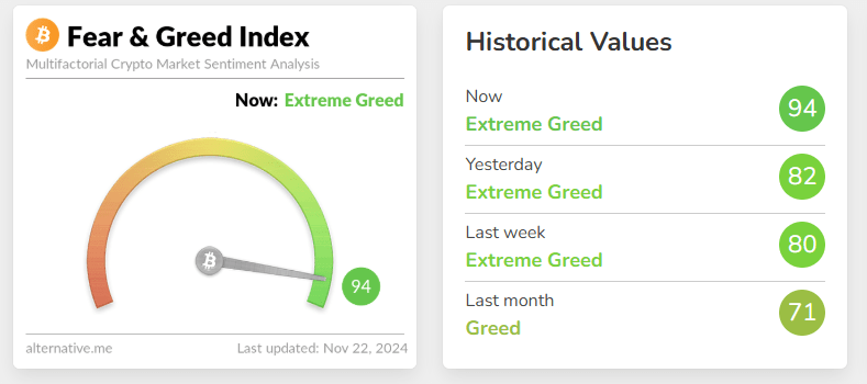 - The Crypto “Fear and Greed” oscillator reaches 94, signaling extreme greed” and essentially the highest level on record.