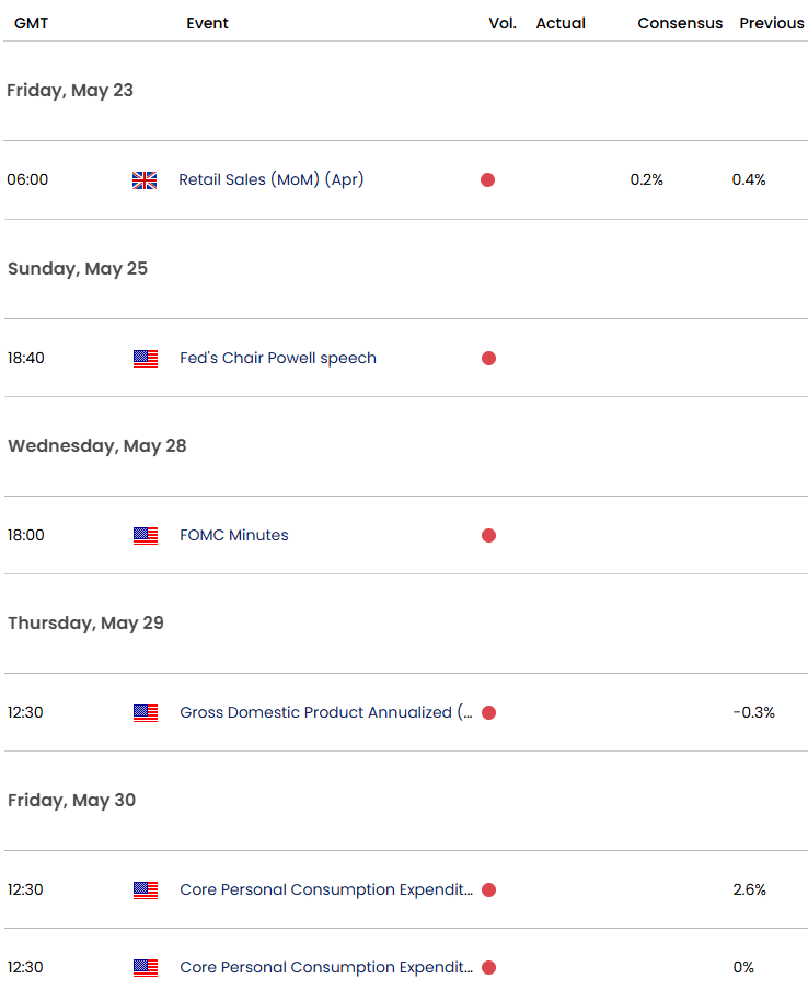 Keep in mind we are heading into an extended holiday weekend (Memorial Day) with key U.S. inflation data on tap into the close of the week / month. Stay nimble into the releases and watch the weekly closes here for guidance. Review my latest British Pound Weekly Forecast for a closer look at the longer-term GBP/USD technical trade levels.