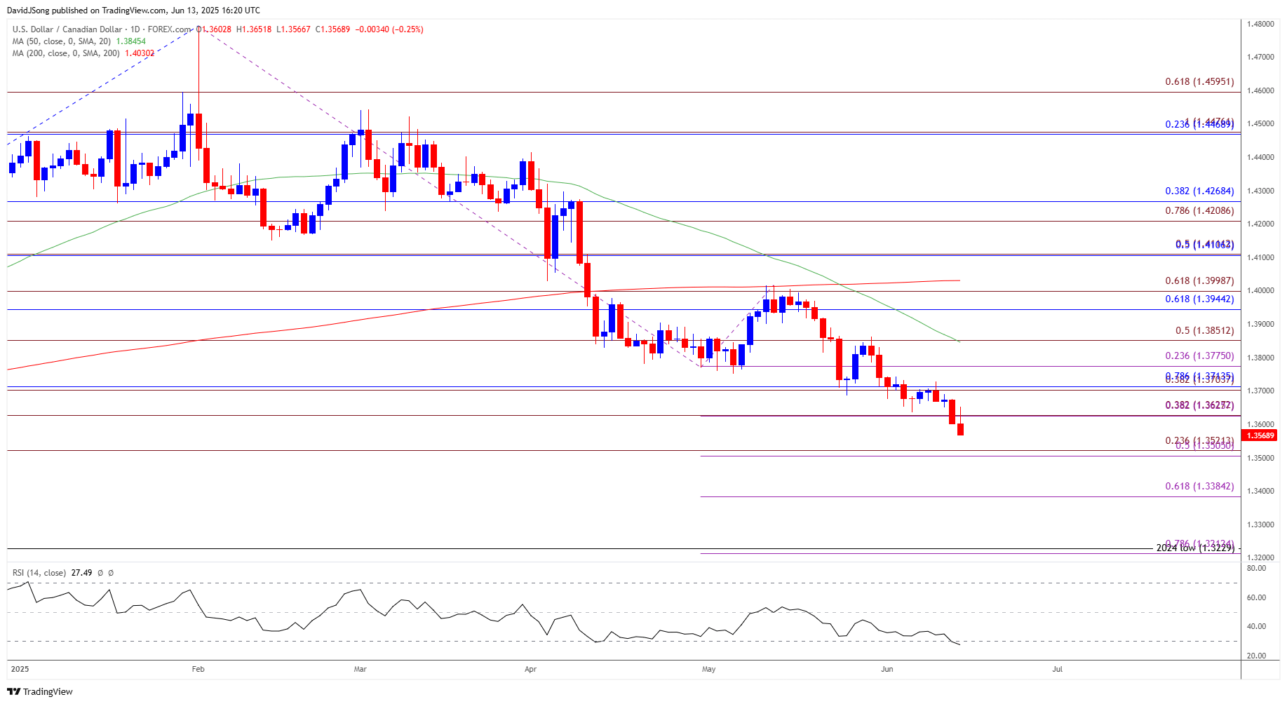 With that said, USD/CAD may struggle to retain the rebound from the October low (1.3473) as it falls to a fresh yearly low (1.3567), but the exchange rate may consolidate ahead of the Federal Reserve interest rate decision on June 18 as the central bank is scheduled to update the Summary of Economic Projections (SEP).