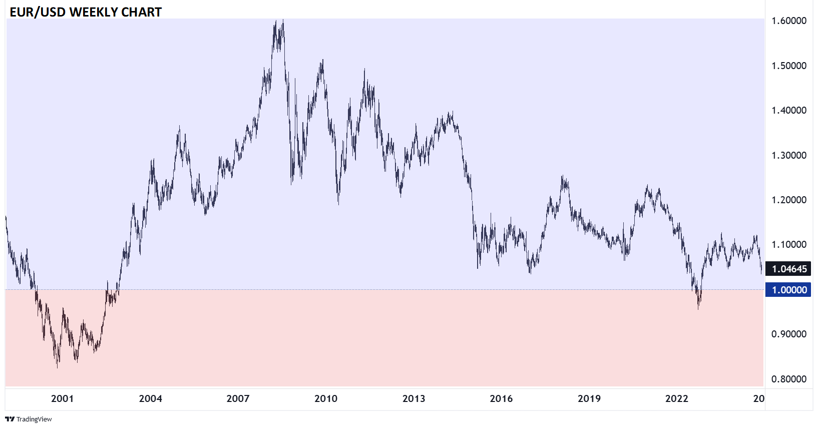 - EUR/USD has only traded below parity (1.00) on two occasions in its 25-year history.