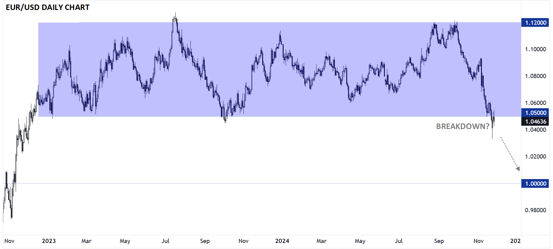 - EUR/USD is threatening to break down from its nearly 2-year range between 1.05 and 1.12.