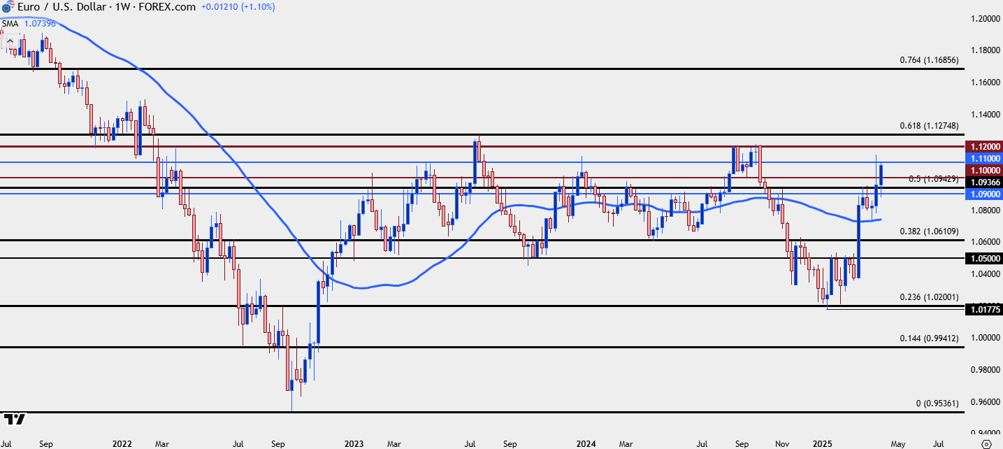 The challenge for bullish continuation right now in EUR/USD is proximity to longer-term resistance; and the mirror image of that, the challenge with chasing the USD-lower at the moment is proximity to longer-term support. We saw a similar dynamic play out last year, when a super-charged EUR/USD in Q3 had a full head of steam as it headed for the 2023 high, which was right at the 61.8% Fibonacci retracement of the 2021-2022 major move.
