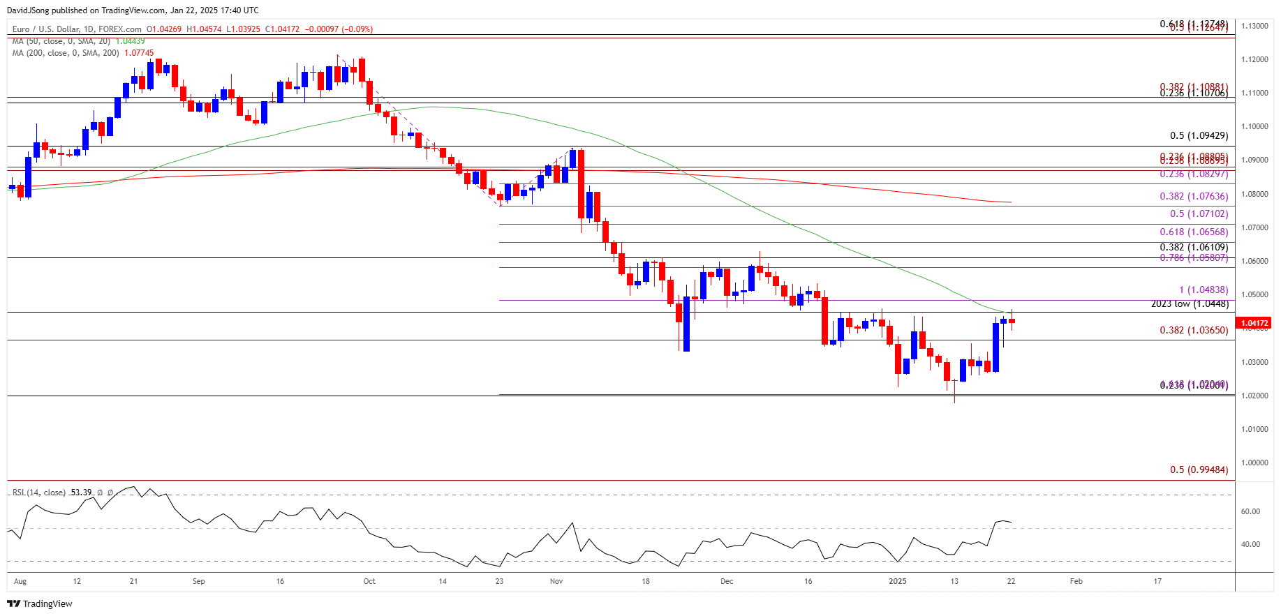 - EUR/USD pushes above the opening range for January as it carves a series of higher highs and lows, with a break/close above the 1.0448 (2023 low) to 1.0480 (100% Fibonacci extension) zone bringing the 1.0580 (78.6% Fibonacci extension) to 1.0610 (38.2% Fibonacci extension) region on the radar.