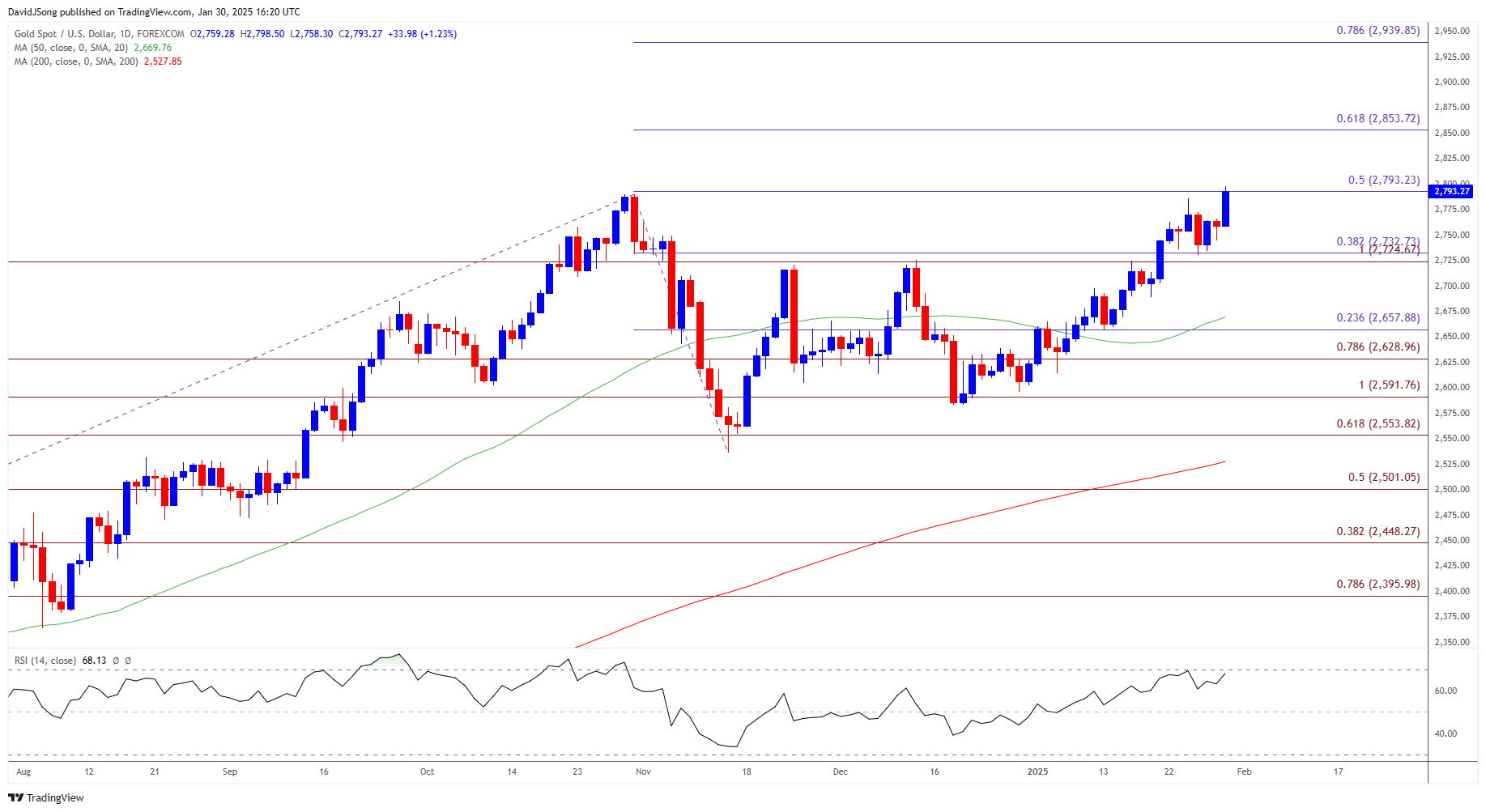 The price of gold extends the recent series of higher highs and lows to clear the 2024 high ($2790), and a move above 70 in the RSI is likely to be accompanied by a further rise in bullion like the price action from last year.