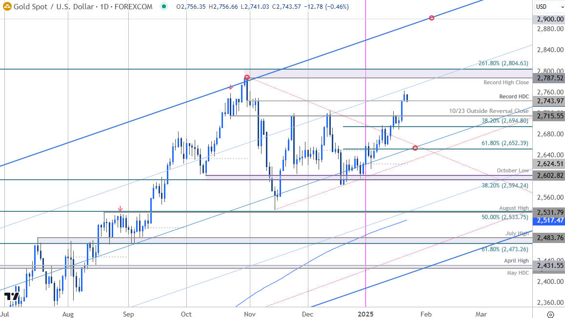 Notes: A closer look at gold price action shows XAU/USD trading within the confines of an ascending pitchfork with the upper parallel converging on the 88.6% retracement of the October decline at 2761. A topside breach / close above this resistance hurdle is needed to mark uptrend resumption towards the next major technical consideration at 2787-2804- a region defined by the record high-close and the 2.618% extension of the 2022 range breakout. Look for a larger reaction there IF reached- note that a breakout here would likely fuel another accelerated advance in gold with subsequent resistance eyed near 2900.