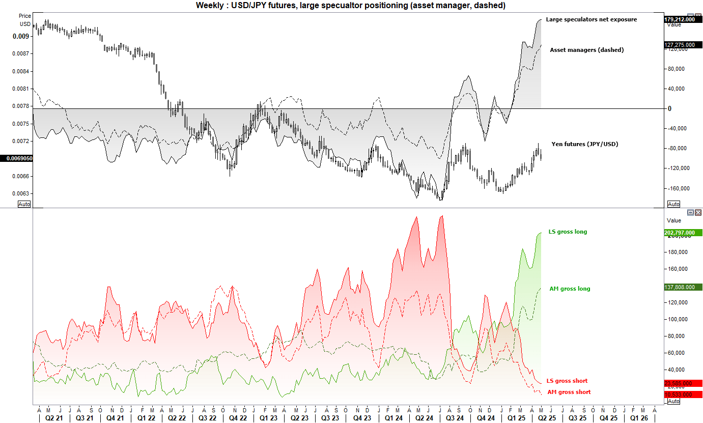 Japanese yen futures positioning shows that large speculators have increased net-long exposure for a fourth consecutive week, setting another record high. Yet, despite this aggressive bullish positioning, the yen fell for a second straight week, indicating a growing sentiment dislocation.