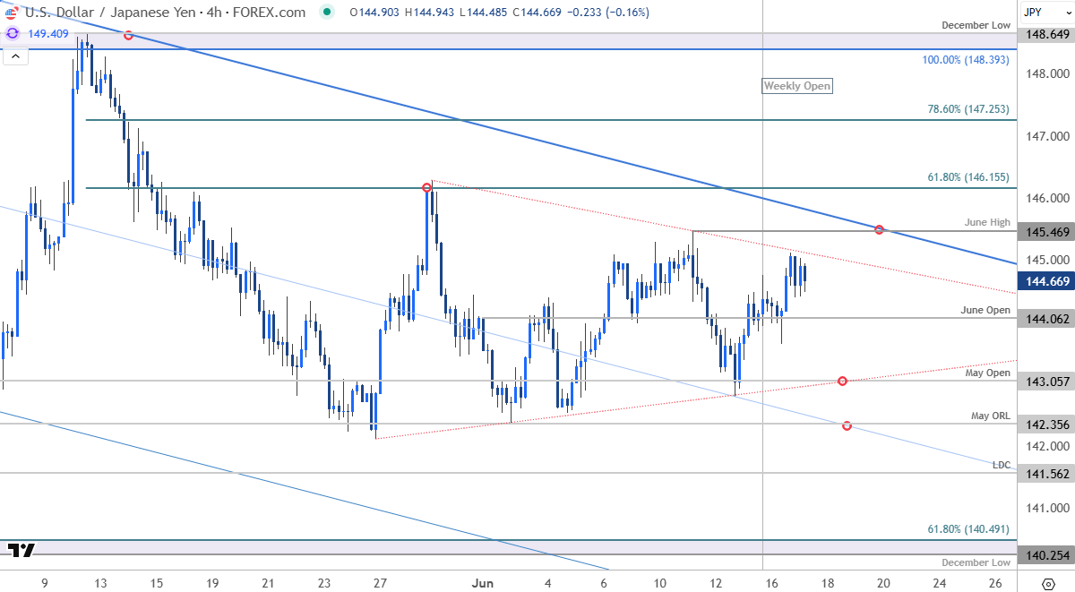 Technical Outlook: In my last Japanese Yen Short-term Outlook, we noted that USD/JPY had turned from Fibonacci resistance and was, “threatening resumption of the broader downtrend. From a trading standpoint, rallies should be limited to 147.25 IF price is heading lower on this stretch with a close below the monthly range needed to fuel the next leg of the decline.” Price plunged to the range lows into the start of June with the monthly opening-range preserved just above- looking to the breakout for guidance here in the days ahead with the broader downtrend vulnerable while above monthly lows.