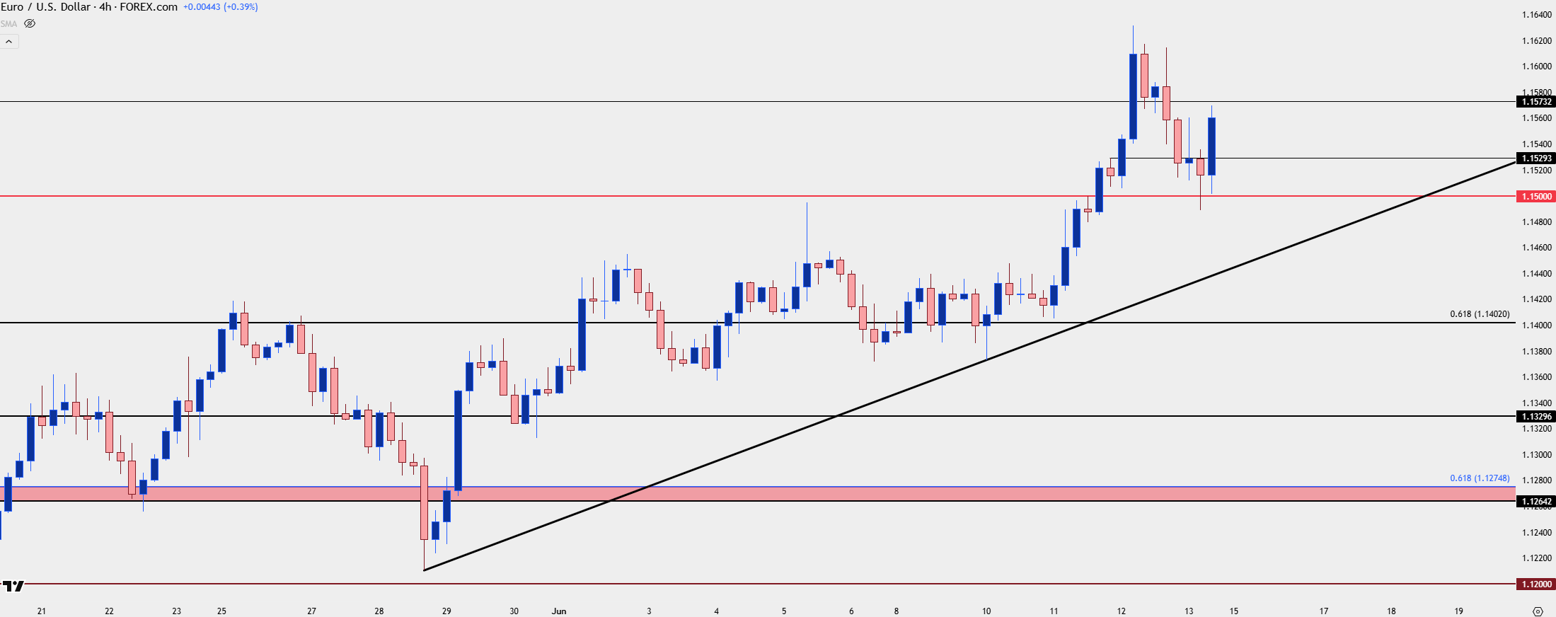That ECB rate decision produced a breakout with price making a move up to the 1.1500 handle. The pullback from that held a higher-low, and then it was on the back of below-expected CPI and PPI this week that USD bears and EUR/USD bulls were able to drive ahead.