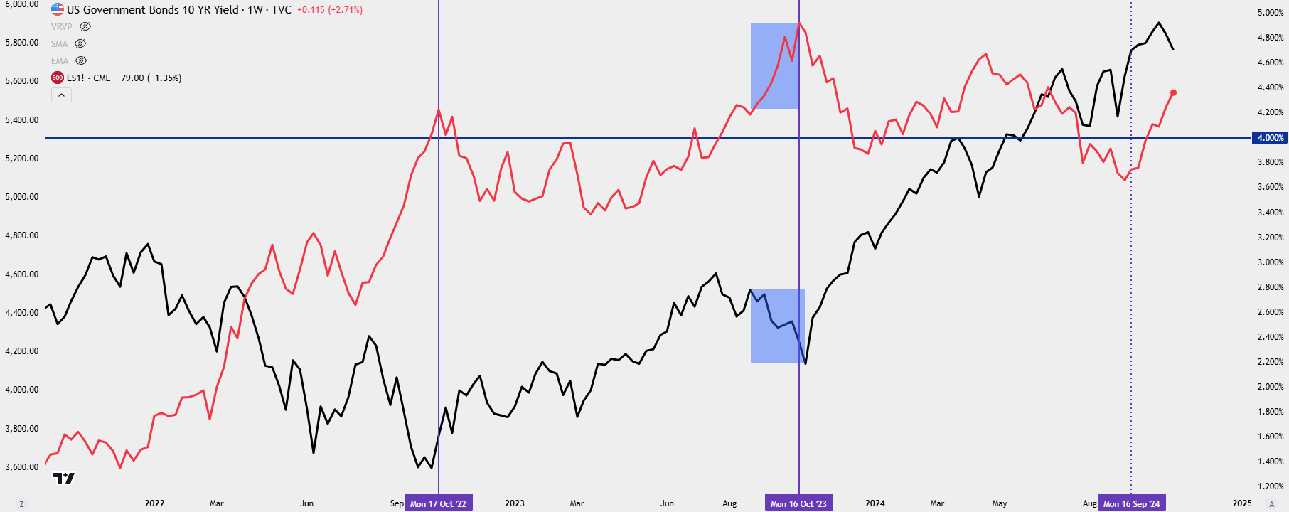 And then last year, when the 10-year climbed above that same 4.34%, equities started to sell-off aggressively, and that largely remained all the way until after the 10-year had touched 5%, albeit briefly. As yields softened, stocks came back to life, and that rally lasted into the end of the year.
