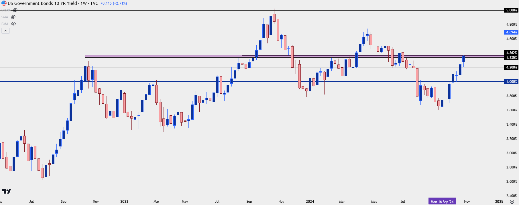 There are a few different factors of concern, however, and this isn’t necessarily something that’s been reflected in price. US Treasury yields have continued to jump higher, and on Friday, the 10-year crossed the critical 4.34% level which has had a bit of drama over the past couple years. That was the high yield on the 10-year back in 2022, right around when stocks bottomed; and when that level was crossed in 2023, US equities took a major turn for the worse before ultimately bottoming right around when the 10-year began pulling back from the 5% level.