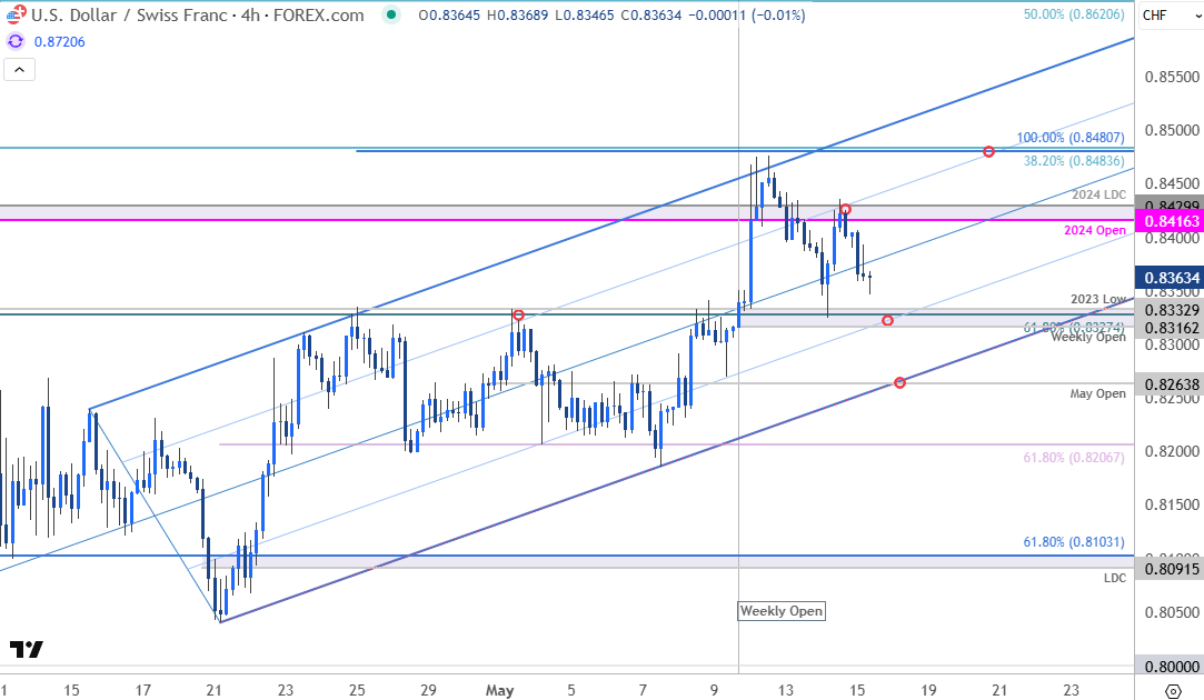 A closer look at Swisse price action shows USD/CHF continuing to trade within the confines of an ascending pitchfork extending off the April lows. The weekly opening-range is defined by the Monday candle just above support at 8313/33- a region defined by the objective weekly open, the 61.8% retracement of the 2011 advance and the 2023 swing low. Key support / near-term bullish invalidation rests with the May open at 8264 with a break below the lower parallel needed to suggest a more significant high is in place / threaten resumption of the broader downtrend towards 8206 and 8100.