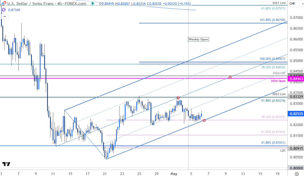 Technical Outlook: USD/CHF plunged more than 12.6% off the yearly highs before rebounding near confluent downtrend support last month at the 61.8% extension of the 2022 decline at 8103. The recovery extended into initial resistance at the 2023 low / 61.8% retracement of the 2011 advance at 8327/33 with the May opening-range taking shape just below. Looking for a breakout in the days ahead for guidance here.