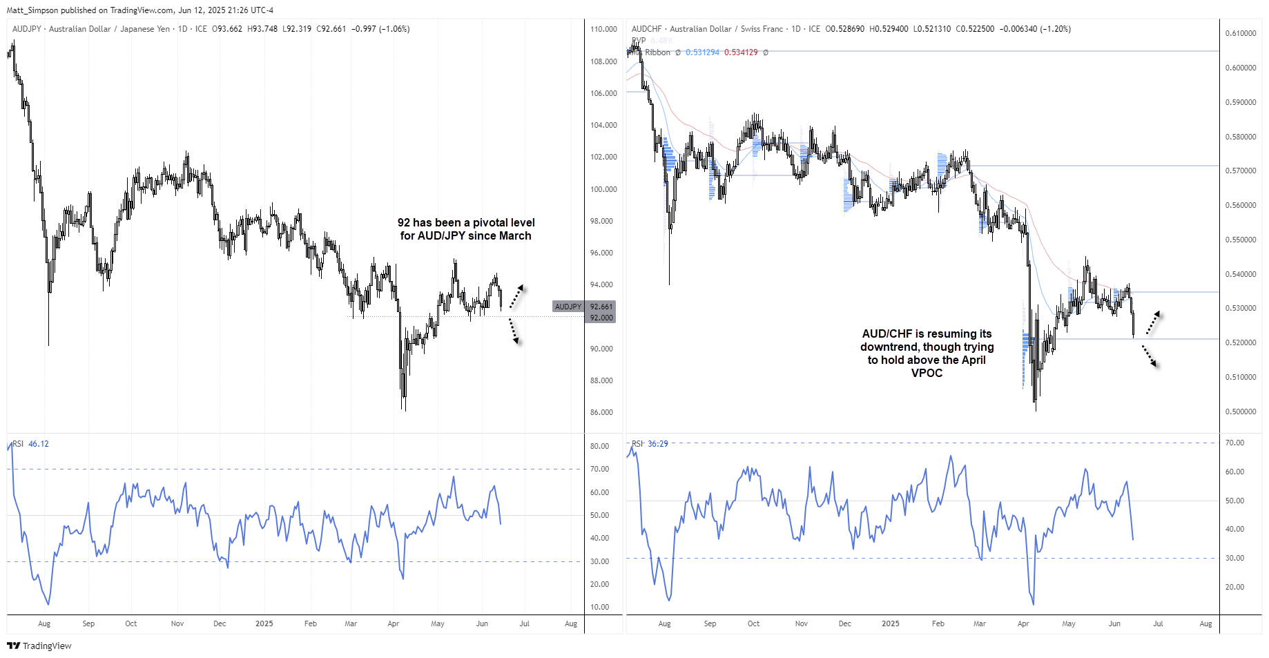 Bearish momentum has taken hold of AUD/CHF, which now appears to be the cleaner short compared to AUD/JPY—at least while the Aussie holds above 92 yen. That said, AUD/CHF is currently hovering above the April VPOC (Volume Point of Control), which presents a near-term pivot. Traders should also monitor crude oil prices, as further gains could support the AUD and cap downside here.