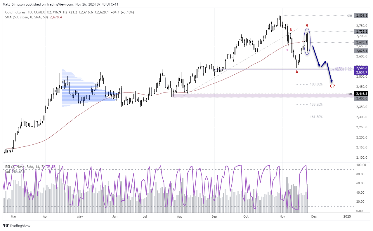 Given the decline from the all-time high (ATH) to the weekly and monthly volume points of control (VPOC) occurred in three waves, it is likely that the 2541.5 low marked the end of wave ‘a’ for an ABC correction. Assuming Monday’s high was the end of wave ‘b’, wave equality for wave ‘c’ could land around 2460.